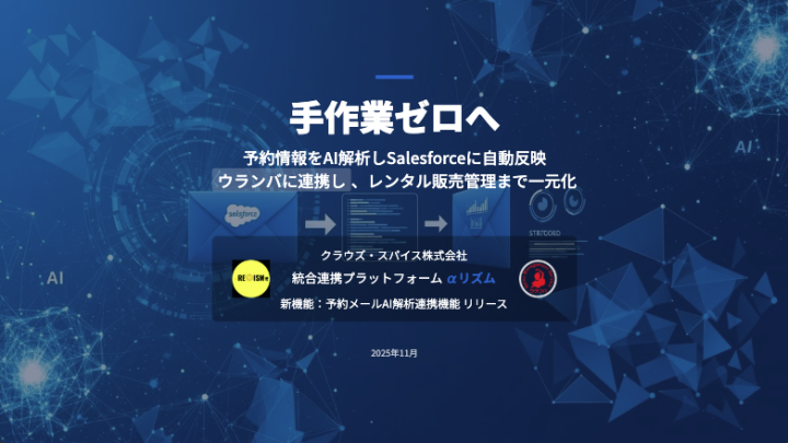 手作業ゼロへ。 AIで自動解析、Salesforceとウランバで一元管理 「αリズム」は、EC・POS・SNS・予約モール・業務ツールなど、あらゆる外部サービスとSalesforceをノーコードで接続できる統合連携プラッ…